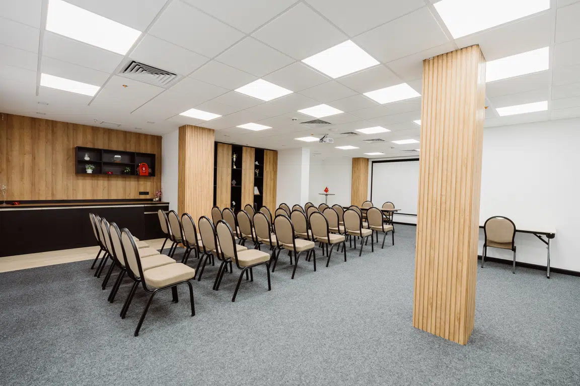 ჩვენი შეხვედრების სივრცეები- Magnolia (76 კვ.მ) – იდეალურია დიდი შეხვედრებისთვის, ტევადობა 60 ადამიანი (თეატრის განლაგება).